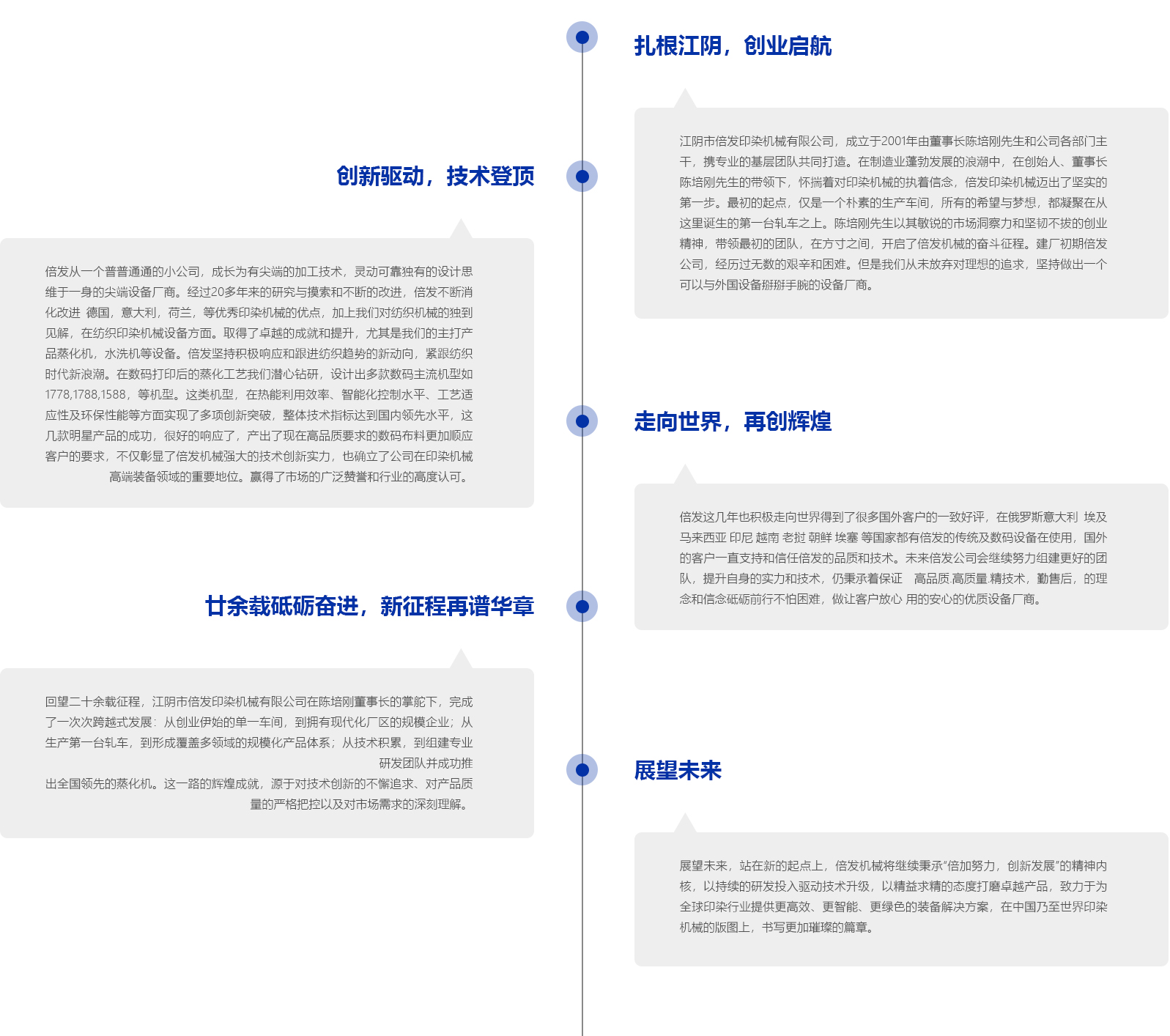 倍發公司一直的信念是做一個讓 客戶滿意 員工幸福公司有利潤的良性公司。倍發不受一切市場同行的不當競爭影響,堅持做好對客戶負責對自身企業負責的 高質量 高技術 設備。做到客戶和倍發互利共贏共同發展的理念,為客戶多想一點無論是價格上還是品質上。董事長陳培剛先生一直教導我們要先學會做人,再學會做事。先保證品質,再贏得市場。我們一直牢記于心,只有先真誠的面對客戶不欺騙不隱瞞客戶。做到實事求是 無論是技術還是質量上,才能贏得客戶的尊重和信任。生意和合作不是一朝一夕 是日久見人心 是來日方長,倍發希望我們的設備可以做到陪伴一代代企業及企業家的發展。為客戶帶來不斷的財富和價值!讓我們一起攜手未來!